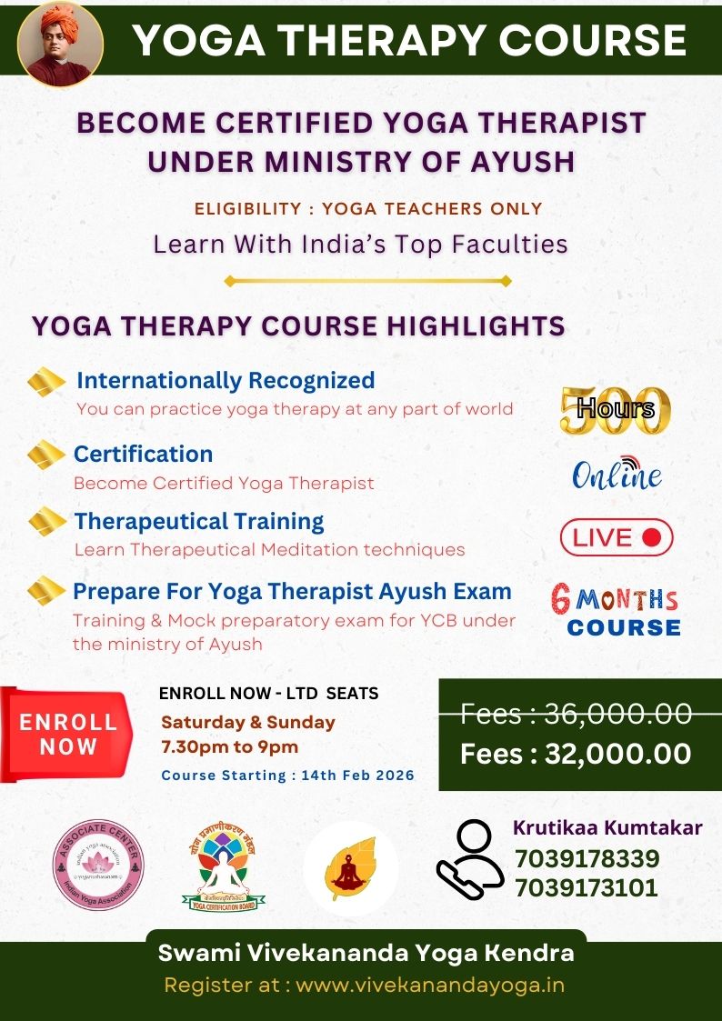 Enroll now to benefit from the limited-time offer! The original fee for the course is ₹36,000. However, if you enroll before 31st Jan 2026, you can take advantage of a discounted price of ₹32000.00 After this date, the fees will be revised. This special offer allows you to access high-quality yoga therapy training at an affordable rate.